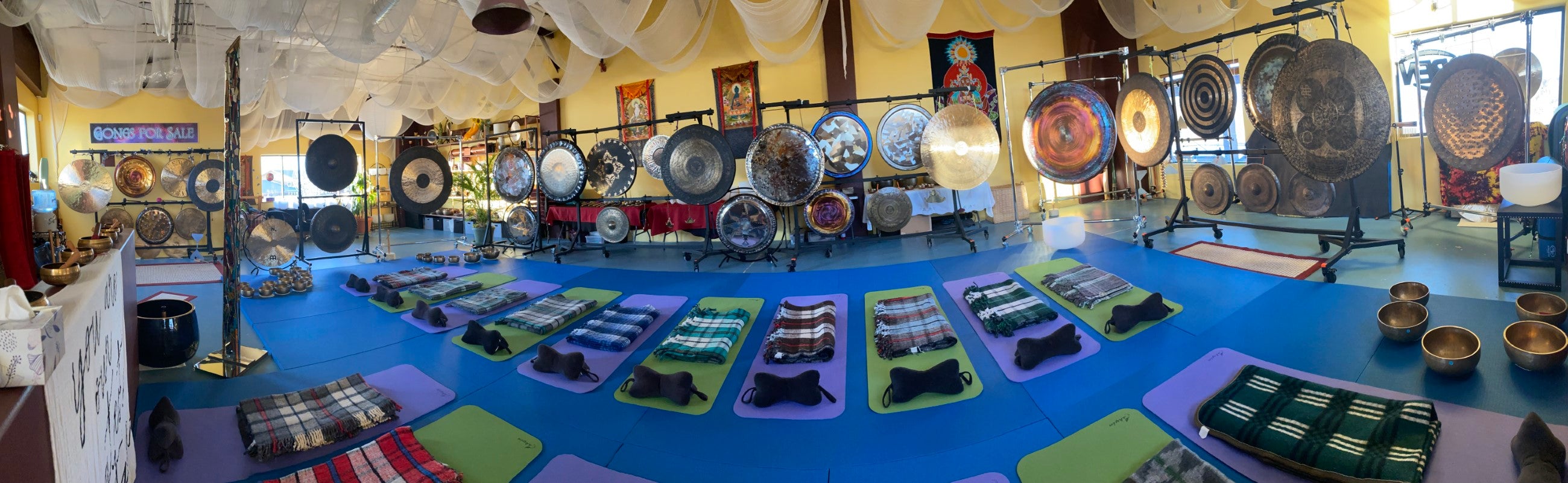 Come and experience the healing benefits of epic spacial vibrations produced by large gongs, singing bowls and other sound instruments made out of new and ancient metals, clay and wood. These unique instruments will surround you in our 1300 square feet acoustical sound space.